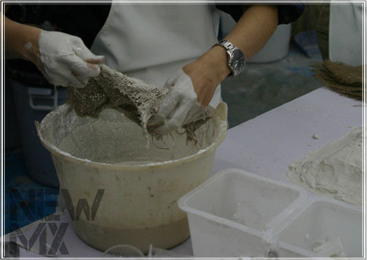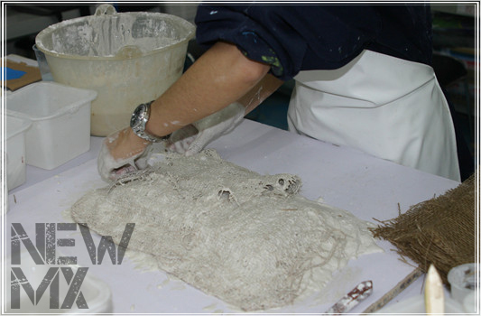 在第一(yī)層石膏漿将幹未幹之際,進行(xíng)加固。和(hé)複制(zhì)人(rén)台一(yī)樣,石膏模具中需要(yào)加入麻布片進行(xíng)加固,其作(zuò)用(yòng)←就(jiù)相(xiàng)當于強力的(de)纖維束,麻布片需要(yào)沾滿石膏漿,将麻布片的(de)空(kōng)隙都(dōu)填滿,÷密實地(dì)包裹在第一(yī)層石膏模具上(shàng),一(yī)般都(dōu)要(yào)滿滿鋪上(shàng)3~4層麻布片。